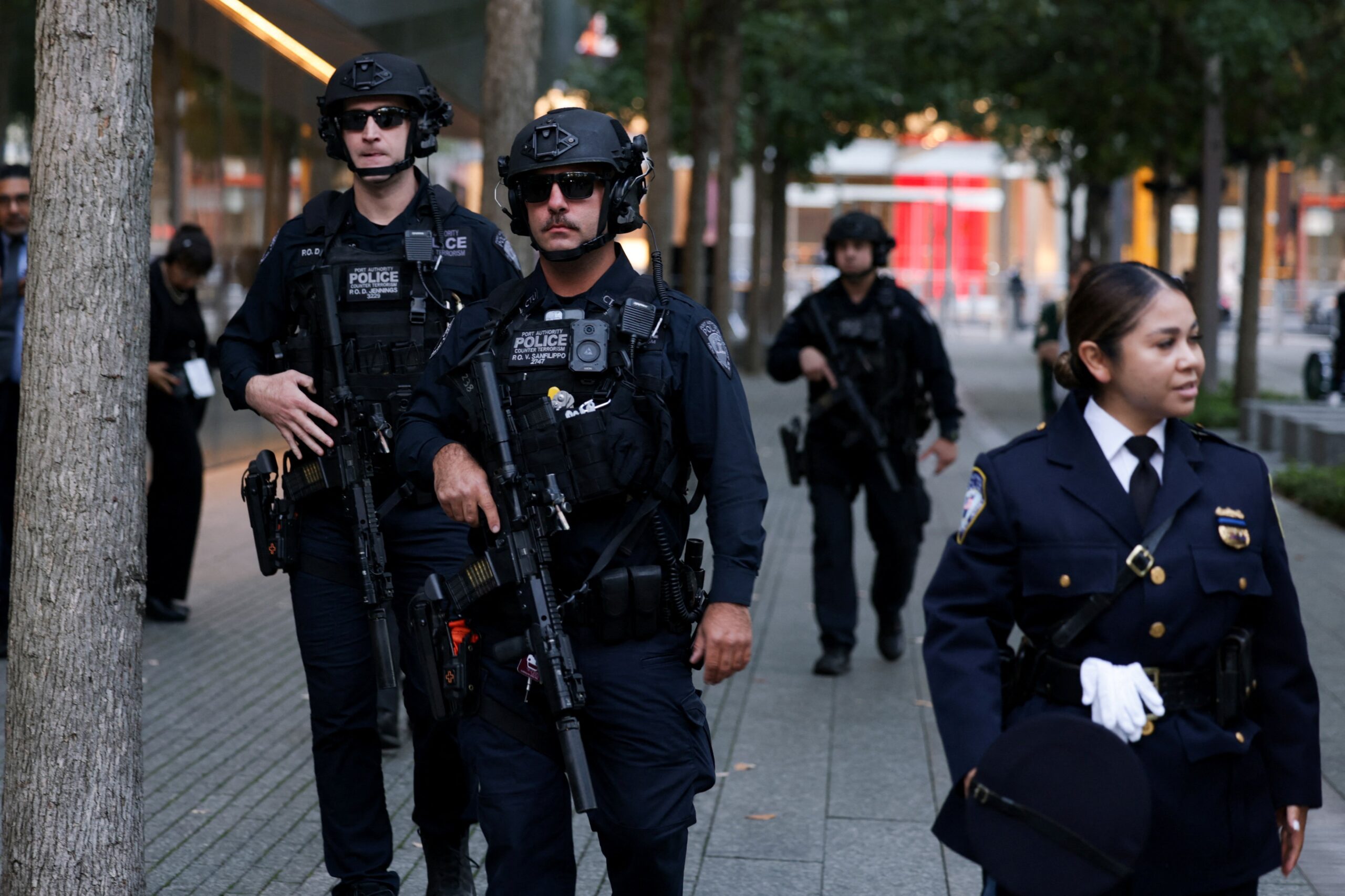 Policiais da unidade de Contraterrorismo da Autoridade Portuária de Nova York caminham antes de cerimônia que marca o 24º aniversário do atentado de 11 de setembro, no Memorial e Museu do 11 de Setembro, em Manhattan, nos Estados Unidos.