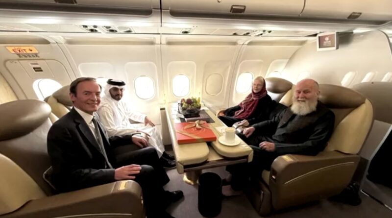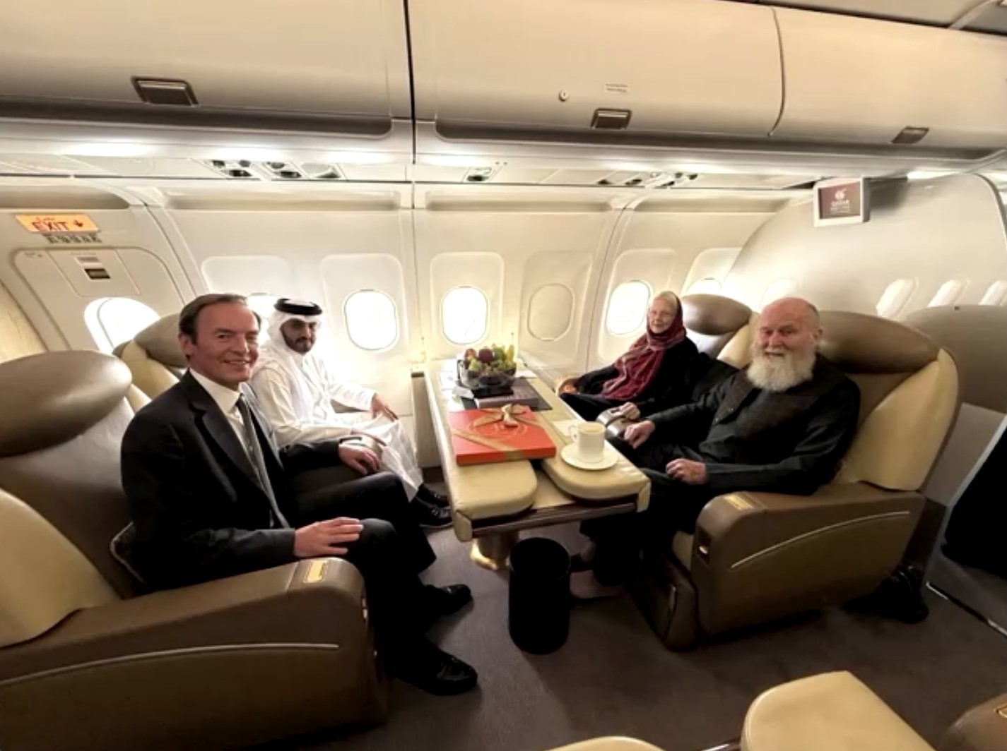 Casal britânico Barbie e Peter Reynolds (à direita) em voo rumo ao Catar após serem libertados pelo Talibã, no Afeganistão, em 19 de setembro de 2025.