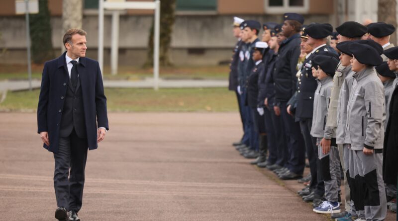 O presidente da França, Emmanuel Macron, passa diante de jovens de uma escola militar durante anúncio de programa militar voluntário, em 27 de novembro de 2025.