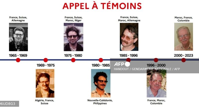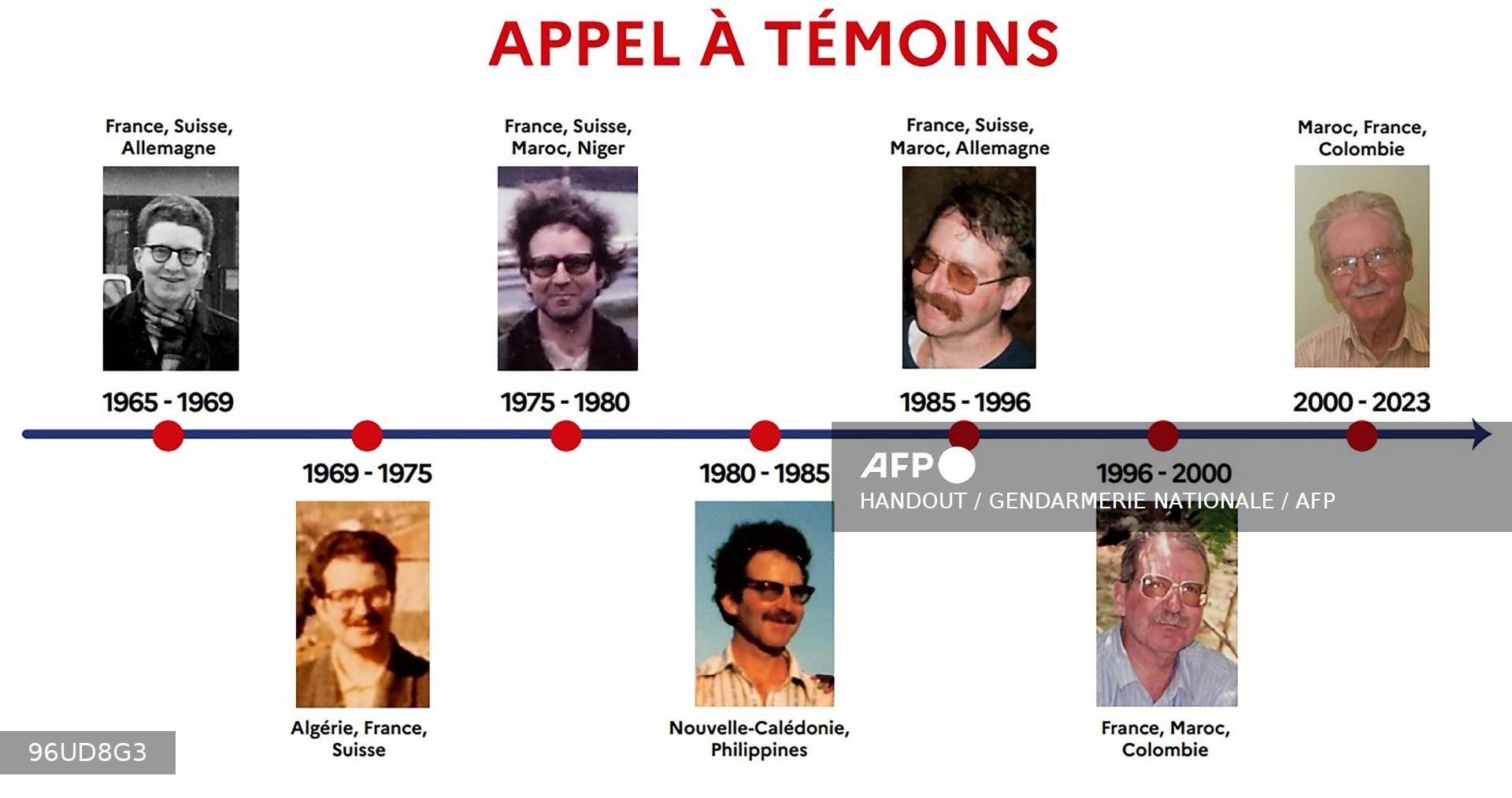 Linha do tempo feita pela polícia da França em fevereiro de 2026 mostra imagens de Jacques Leveugle, professor francês acusado de estuprar 89 menores ao longo de 35 anos.