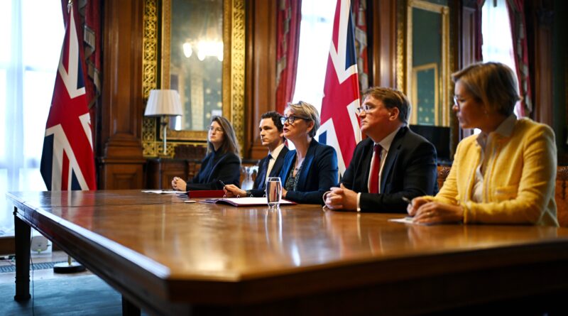 A ministra das Relações Exteriores do Reino Unido, Yvette Cooper, ao centro, discursa durante uma cúpula virtual no Ministério das Relações Exteriores e da Commonwealth, em Londres, na quinta-feira, 2 de abril de 2026, com cerca de 35 países para discutir formas de reabrir o Estreito de Ormuz.