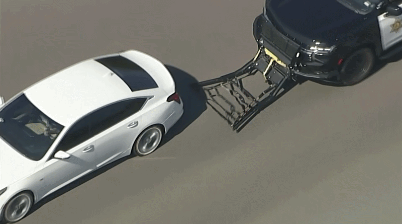 Após uma hora de perseguição, os policiais decidiram usar uma viatura com um dispositivo de imobilização e o carro do suspeito perdeu o controle, colidindo contra o muro de concreto de uma residência do bairro Jurupa Valley.