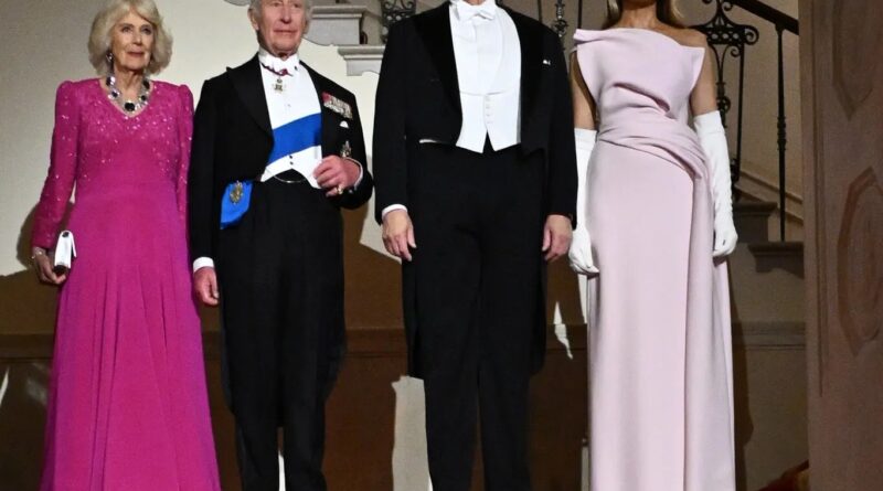 O rei Charles III e a rainha Camilla em um jantar de Estado com o presidente Trump e a primeira-dama na Casa Branca, na terça-feira