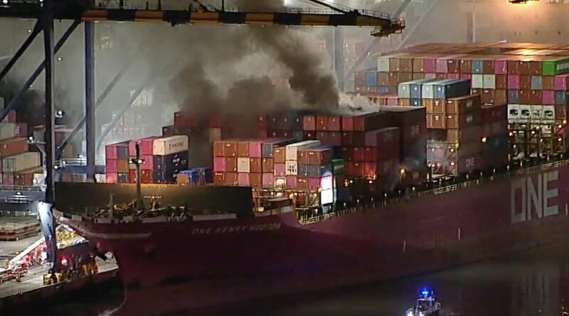 Ler maisFumaça subindo de um incêndio em um navio atracado no Porto de Los Angeles, em 21 de novembro de 2025