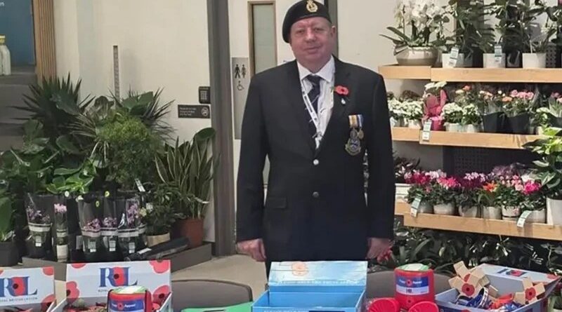 Andrew Johnson, maquinista da LNER, fotografado em uma barraca da Royal British Legion, instituição de caridade das Forças Armadas do